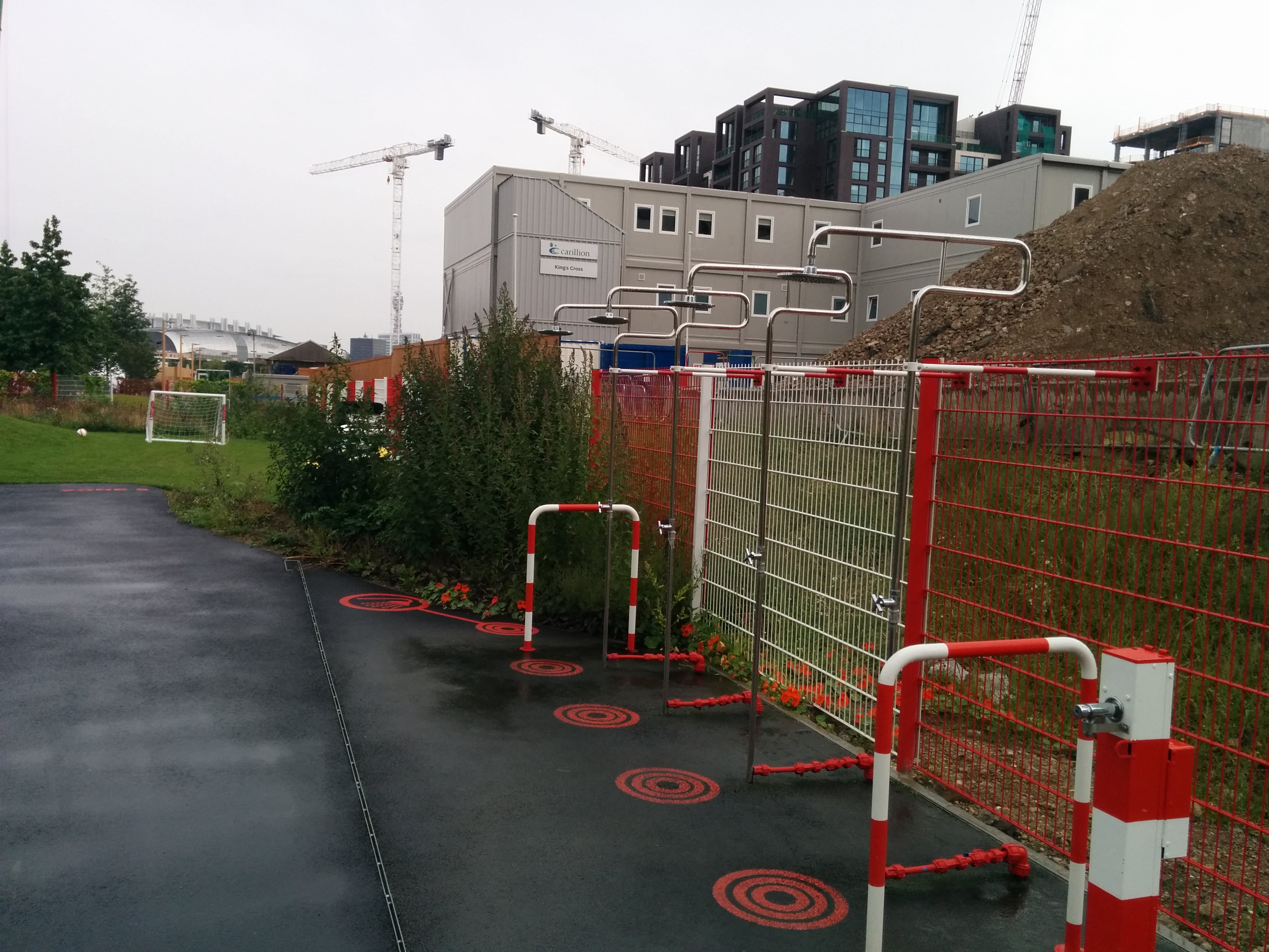 When you enter the viewing platform (can be done without a ticket), you realise, how big the green area is and what a weird location- surrounded by perfectly manicured new buildings, construction sites etc. – and how the construction theme is resembled in the overall design (see all the red/white stripes like in construction tape?)